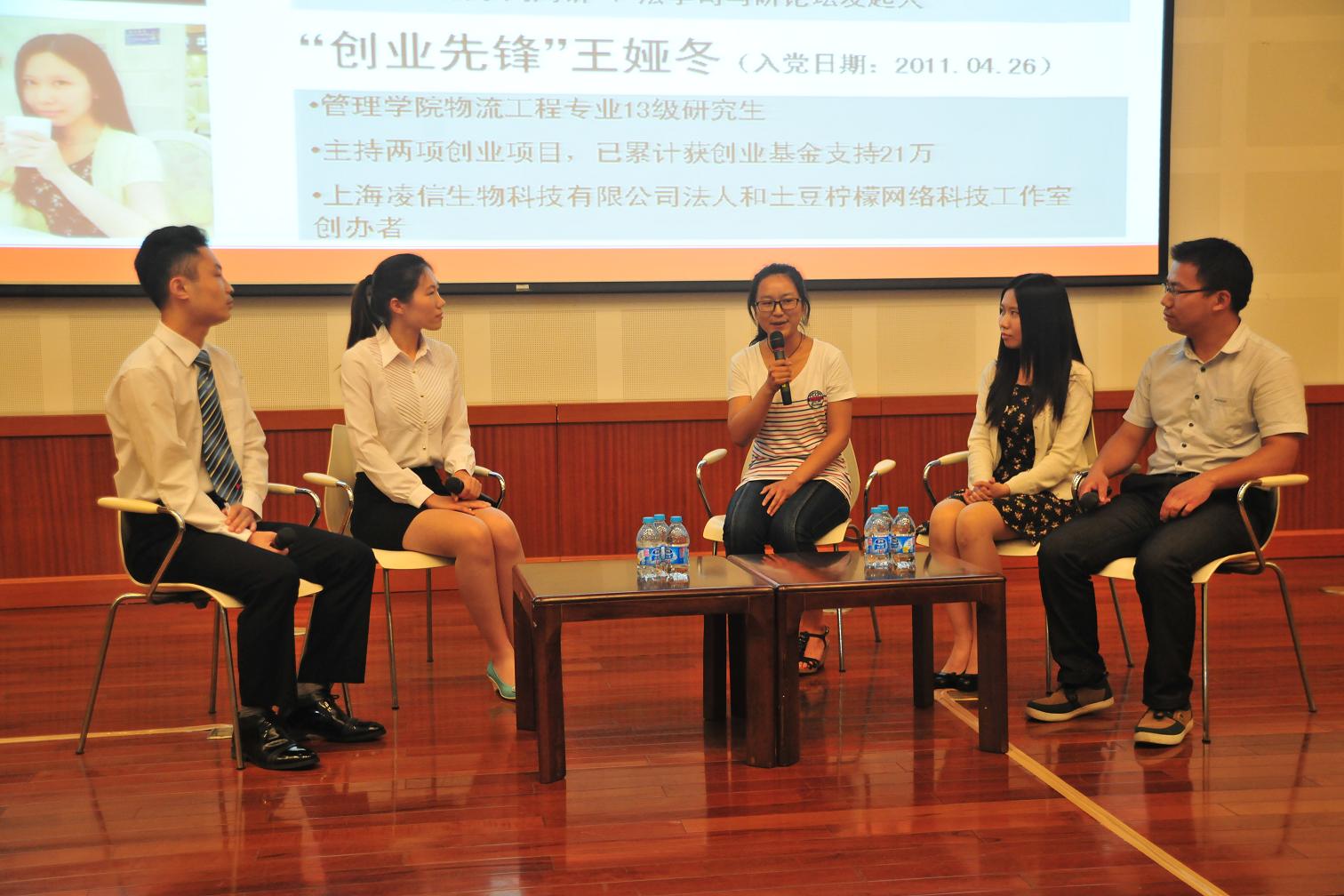 结业典礼上, 3位来自不同学院的党员代表进行了交流。“全能学霸”纺织学院12级本科生王英男不仅学习成绩优异,而且积极投身各类社会实践和公益活动,她说,通过培训班的学习,坚定了理想信念,今后更要勤于学习、勇于实践,更好地服务同学、服务学校、服务社会。“实践达人”人文学院11级本科生阮何明今年作为学生代表全程参与了学生宿舍空调安装工作,平日里他坚持为同学做实事,多次参与志愿献血活动等,访谈中他表示,培训班的学习使他受益匪浅,作为一名党员要常怀感恩之心,从身边的小事做起,增强责任意识,勇担社会重任。“创业先锋”管理学院13级硕士生王娅冬已于2012年注册公司,她的创业团队核心成员全部是党员,她说,党组织的教育培养赋予她创业必备的素质和能力,创业的实践和磨练实现了她作为一名党员的中国梦,党员要做到学习先行、业务先钻、困难先上、责任先当,严格要求自己,起到表率作用。