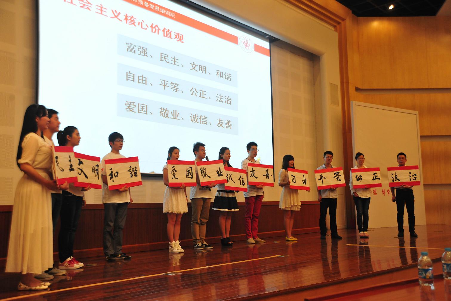 最后,各学院预备党员代表结合自身学习生活经历,诠释了对社会主义核心价值观24个字的理解,并承诺自觉践行社会主义核心价值观,从自我做起,使社会主义核心价值观成为自己的基本追求并身体力行,大力将其推广到全社会去。