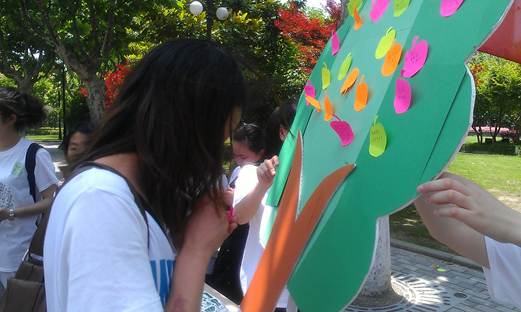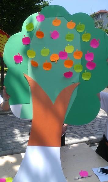 在活动现场,协会宣传部的同学们制作了精美的“苹果树”,还准备了苹果型的便利贴。当同学们中午下课以后,纷纷来到了“苹果树”前,在苹果型便利贴上面写下自己的心愿、积极向上的词语、祝福等等,然后亲自贴到苹果树上。之后,如果有同学如果发现上面有自己此时正需要的“正能量”词语,她便可以撕下拿走,作为自己的“正能量”。