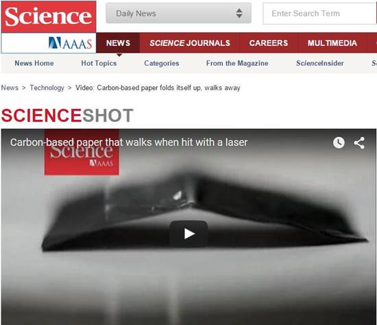 Science报道见Science DOI:10.1126/science.aad7403 (链接:http://news.sciencemag.org/technology/2015/11/video-carbon-based-paper-folds-itself-walks-away)。