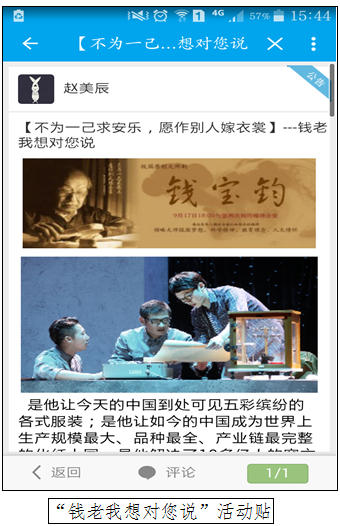2015年9月17日晚,由上海市教卫工作党委、上海市教委指导,我校制作的校园原创话剧《钱宝钧》登陆松江校区锦绣会堂与2015级新生见面。化工生物学院易班发展中心紧密联系新生活动,在化工生物学院2015级新生公共群推出“不为一己求安乐,愿作别人嫁衣裳---钱老我想对您说”的主题活动。此次活动旨在利用易班平台,通过举办线上活动和新生们产生互动。不仅可以让新生诉说对钱老的敬佩之情,而且也可以让他们逐渐熟悉和使用易班。