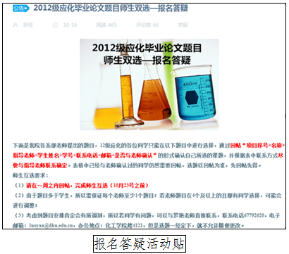此次的毕业论文题目涉及范围广,同时指导教师的阅历丰富,知识面广,给同学们的可选择性也很大。因此活动帖一经发出,同学们都纷纷回帖,联系老师,确定毕业论文题目。截止10月23日,话题阅读量达465次,评论数达66条。同时,各位课题组的指导老师也对同学的回帖进行答复。应用化学系本科教学