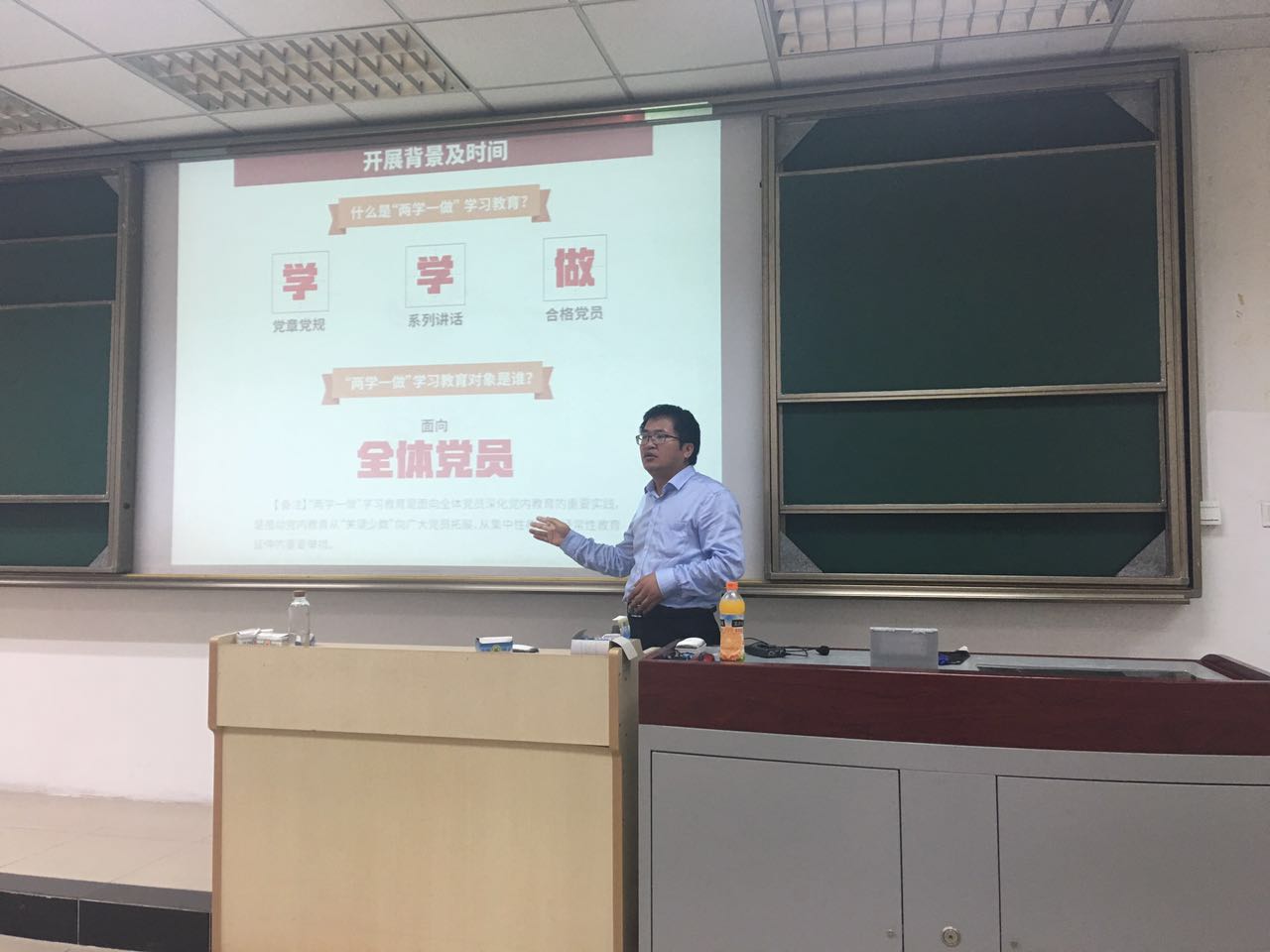 孙宝忠教授引导大家回顾“两学一做”是什么,即“学习党章党规、学习习近平总书记系列重要讲话、做合格党员”三方面的精神内涵,明确了“两学一做”精神的学习对象为全体党员,同时提出了践行“两学一做”的总体要求,要一字一句、原原本本地学,在此基础上要紧跟时代步伐,依托时代背景地学。还要注重循环,在实践中反复学习。