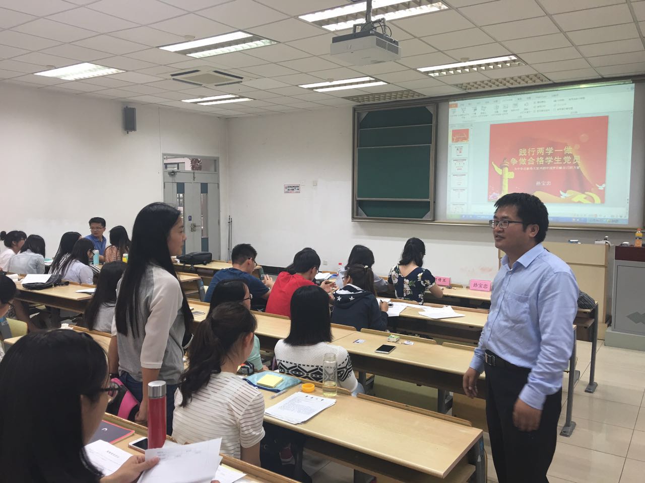 随后孙宝忠教授结合庆祝建党95周年,联系自身工作实际,运用身边事例,现身说法,对全体学生党员提出了要求与希望。他讲到,做合格学生党员要做到“四讲四有”,即讲政治、有信念;讲规矩、有纪律;讲道德、有品行;讲奉献、有作为,时刻严格要求自我。注重自身的成长成才,从成长、成功、成事和成熟四个方面不断锤炼自己。成长离不开党组织的培养,离不开群众的支持,更离不开自己的努力。成功则是靠内力与外助,加之机遇的垂青。成事要求我们要认真、有恒心、做事为人讲求方式方法。成熟则是要以“淡、静、藏”为行为向导,做到淡泊名利宁静致远。总之,作为一名学生党员,要增强政治意识,认真履行责任,不断提高素质能力,坚持改进工作作风,以高标准、严要求来做一名合格党员。孙宝忠教授在讲座最后还与现场的学生党员和重点发展对象进行了互动交流,从学业、工作、生活等各方面为学生党员答疑解惑。