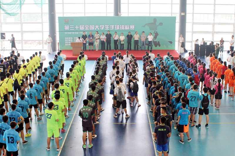 7月17日,第三十届全国大学生手球锦标赛在我校松江校区体育馆开幕。松江大学园区管委会常务副主任吴楚武,校党委副书记、纪委书记金海燕,上海市教委体卫艺科处处长丁力、松江体育局局长孔林德、中国大学生手球协会秘书长姜志明出席开幕式。来自全国20所高校的28支队伍共计400多名运动员报名参加了本次锦标赛。