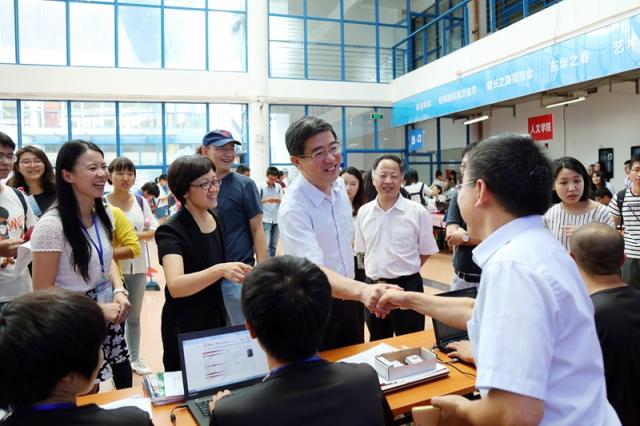 9月10日,东华校园迎来5417名2016级新生。3409名本科生和2008名研究生怀着憧憬和希望从祖国各地来到东华,开启他们崭新的大学生活。校党委书记朱民,校长蒋昌俊,党委副书记刘淑慧、崔运花,党委副书记、纪委书记金海燕,副校长刘春红、邱高、李永智等校领导先后来到迎新现场,分别在地铁站迎新点、新生报到处、慈善爱心屋、新生宿舍等处看望新生,慰问学生志愿者和迎新工作人员。