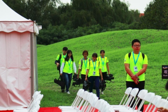 图三、图四:赛前志愿者们要提前入场做好相关布置和引导工作。