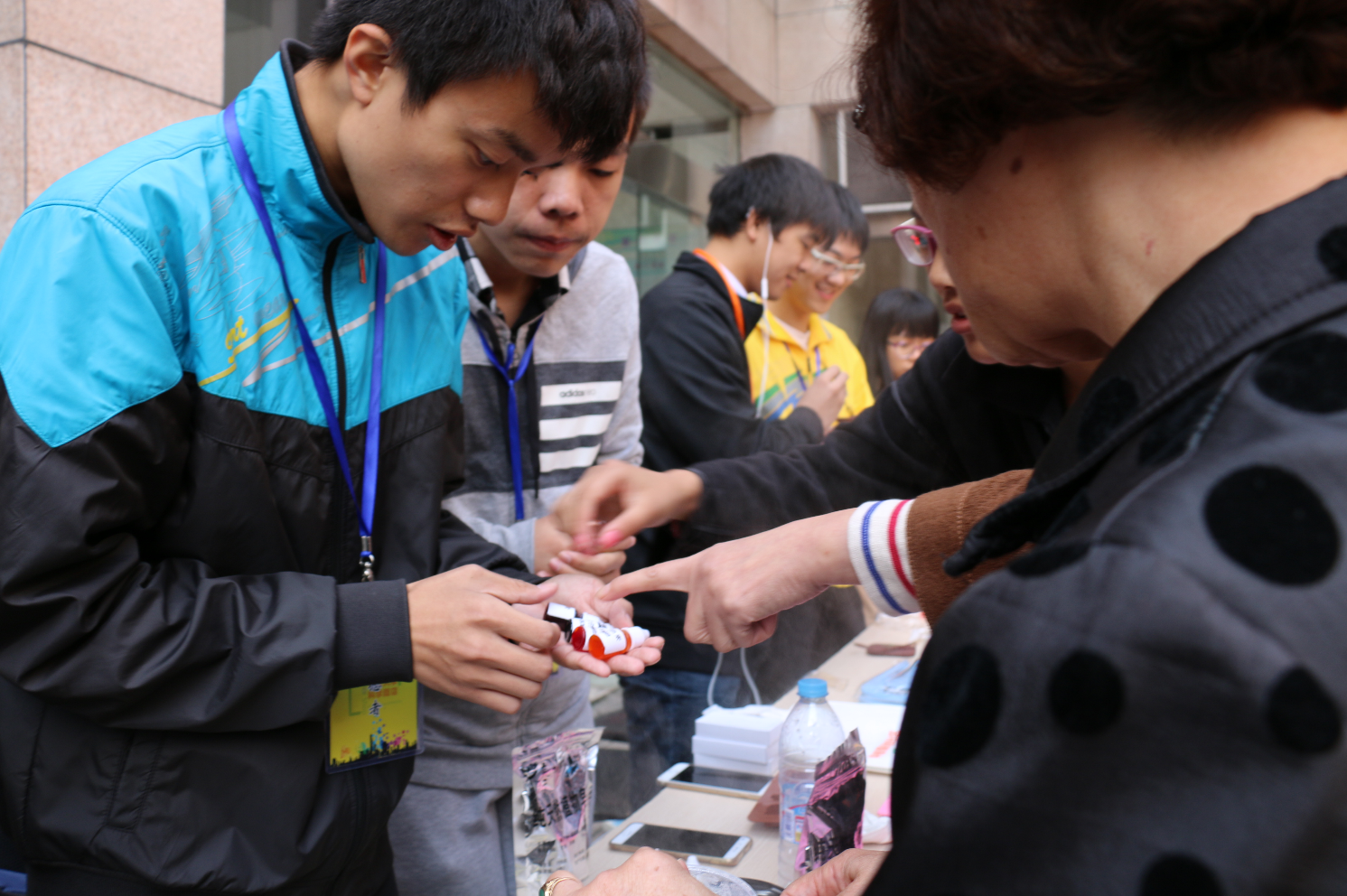 开幕式后还举行了室外科普展示环节。室外的6个科普服务摊位前挤满了前来咨询的居民:志愿者们讲解了空气甲醛检测仪、噪音检测仪、太阳能风车等设备的原理并提供给居民互动体验;视力检测、眼镜清洗仪、血压测量器等服务性的设备也带到了现场,志愿者为热情参与的居民们献上了最贴心的服务;另有通过专业仪器现场制作的手工皂、科商精美周边等礼品回馈给居民们。志愿者们用心为每一位前来咨询的居民详细讲解,通过实验和仪器验证问题,将活动中受关注的科学问题整理归纳,出版成科普杂志和宣传单。居民们表示,志愿者带来的便民服务贴近生活,适合大众,内容即时性强,正对居民们的“口味”。