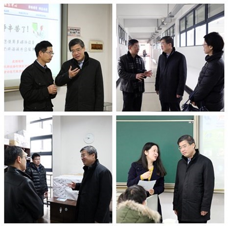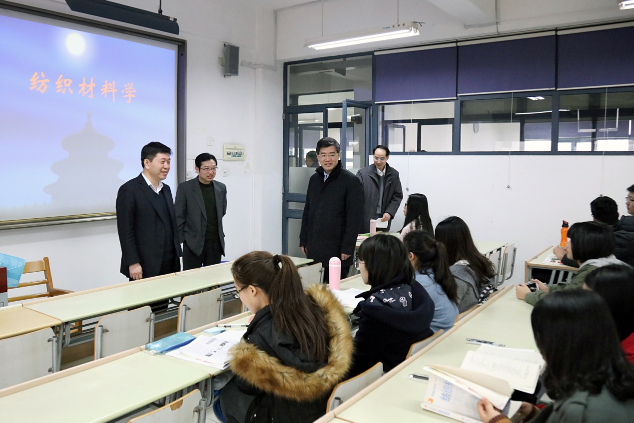 在春意盎然的东华校园里,师生们开始了新学期的工作、学习和生活。2月20日,校党委书记朱民、副校长邱高在相关部门负责同志陪同下,于新学期第一节课来到松江校区教学楼察看课堂教学情况,在课前与师生亲切交流。