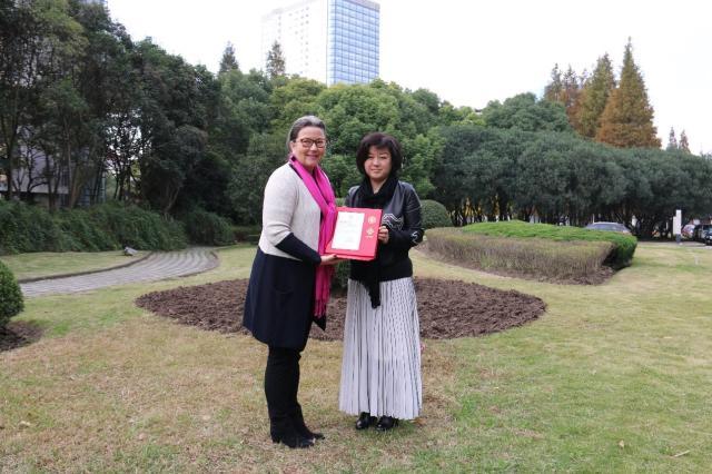 刘春红副校长代表学校向艾晓安女士( Mrs. Anna Desiree Adema)赠送捐赠证书留念