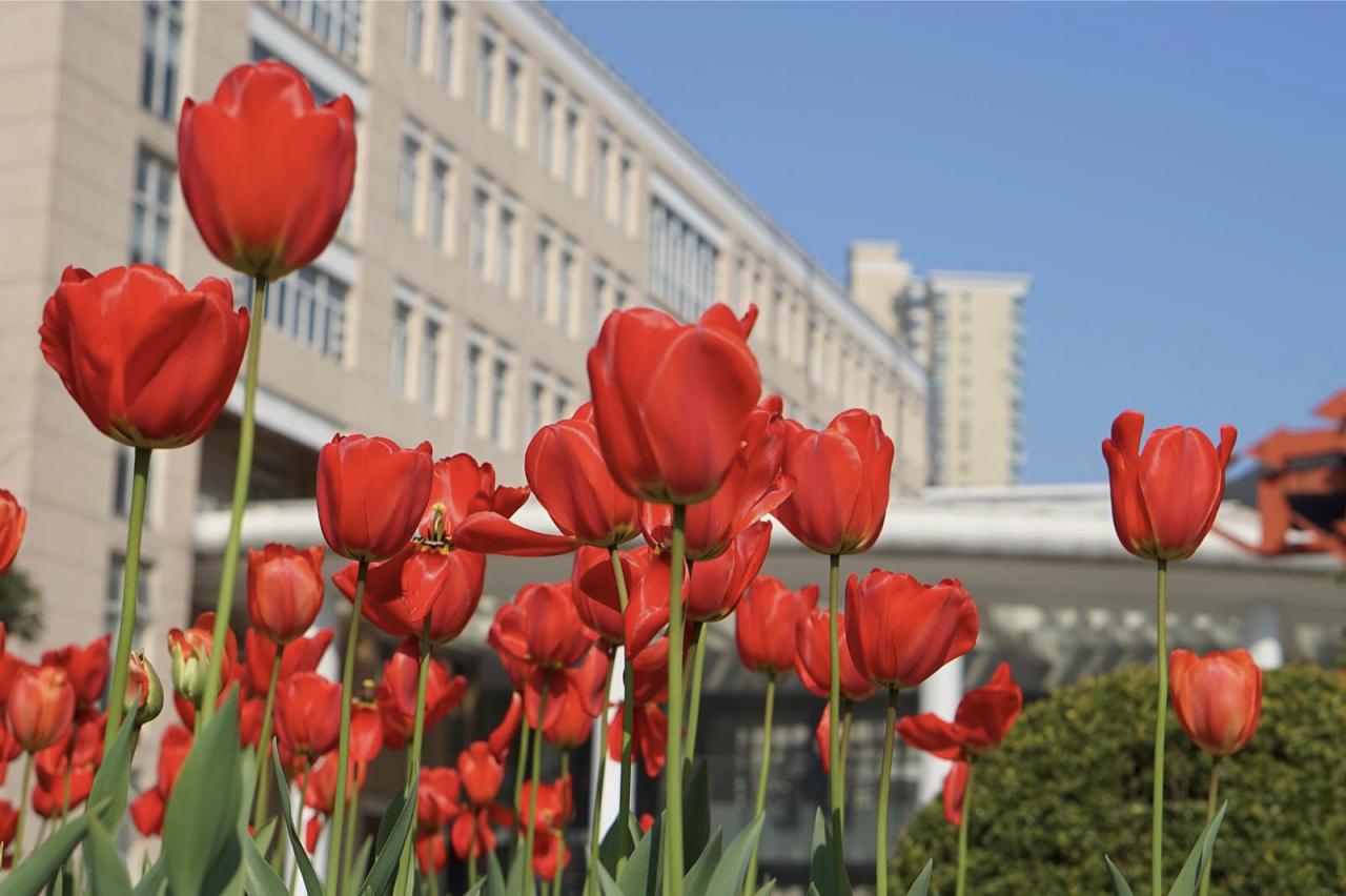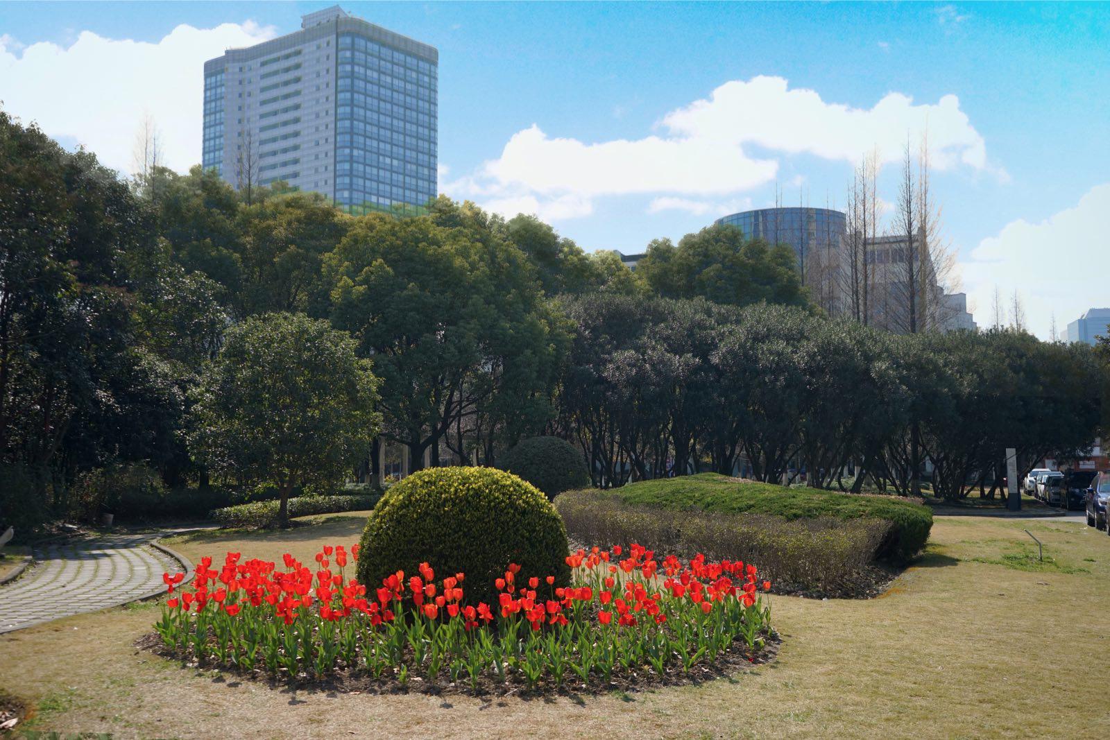 近日,漫步在校园中,不经意间或许你会发现在我校延安路校区逸夫楼前绿地广场上,去年年底由荷兰驻沪总领事馆捐赠我校的600颗荷兰国花——郁金香的种球渐次绽放盛开,为春日的校园增添了一抹亮色。