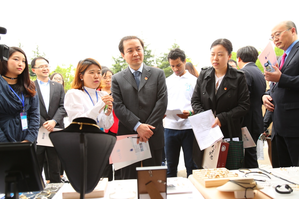 在校团委和国际文化交流学院的推荐下,来自我校国际文化交流学院的韩国研究生金贞贤(JUNGHYUN KIM)带着自主设计研发的珠宝饰品代表我校留学生参展。共青团中央学校部部长杜汇良,共青团上海市委副书记刘刚等领导以及来自乌克兰、土耳其等8个国家的驻沪领事代表参观了我校展台,听取了金贞贤的项目介绍,并给予充分肯定。