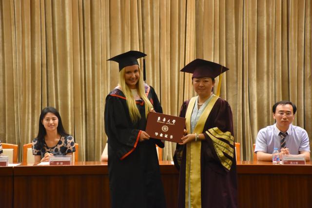 刘春红在毕业典礼上讲话,对留学生们能够顺利毕业表示祝贺,对远道而来参加毕业典礼的家长表示热烈欢迎,对留学生在校期间为学校取得的各项荣誉表示欣慰。她代表母校为留学生们送上了毕业祝福,希望留学生们毕业后牢记“崇德博学,砺志尚实”的东华校训,不断在实践中学以致用,施展才华,不断超越自己,不断追求卓越,成为国与国之间的友好使者,为发展中国和世界人民的友谊做出贡献。