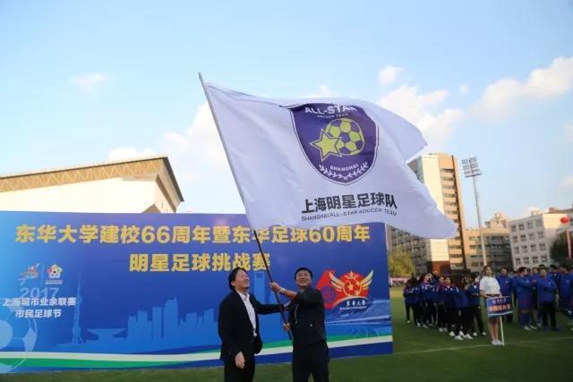 (朱广沪向东体上海明星足球队主教练成耀东授旗)