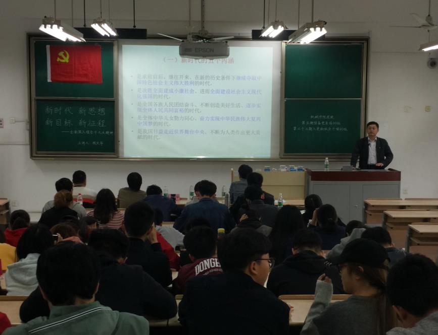 机械学院党委把学习宣传贯彻党的十九大精神作为学生党员和入党积极分子教育培训的重要内容,11月7日,机械学院邀请我校学习宣传贯彻党的十九大精神讲师团成员、马克思主义学院副院长钱文华做“新时代、新思想、新目标、新征程——全面深入领会十九大精神”的专题报告,机械学院党员教师代表、学生党员、入党积极分子现场聆听了报告。