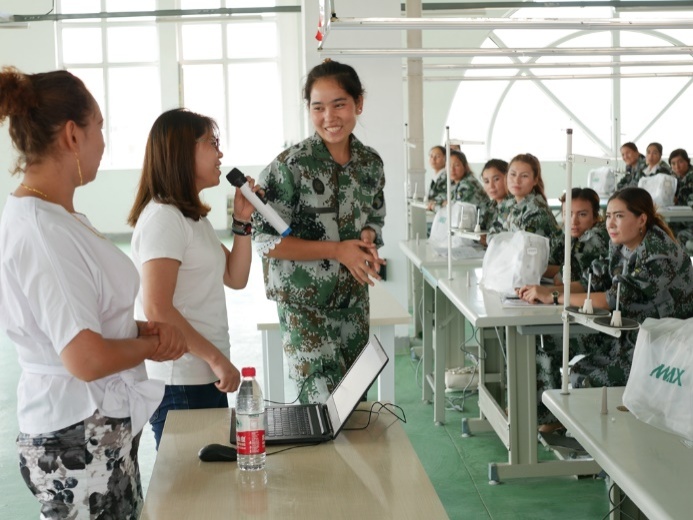 面对现代化装备和零基础员工,邱夷平知道他们需要什么,他早已请泉州师范学院专业教师崔丽娜备好入门课。“看见红色,你们想到什么?”崔老师指着瓶装水的红色包装问。经过翻译,工人们纷纷回答“婚礼、国旗、辣椒……”同胞们都笑了,这正是服装色彩设计和搭配的基本感觉。同期,来自天津工大、苏州大学等校师生则手把手为缝纫组调试并教授了新型缝纫机具。