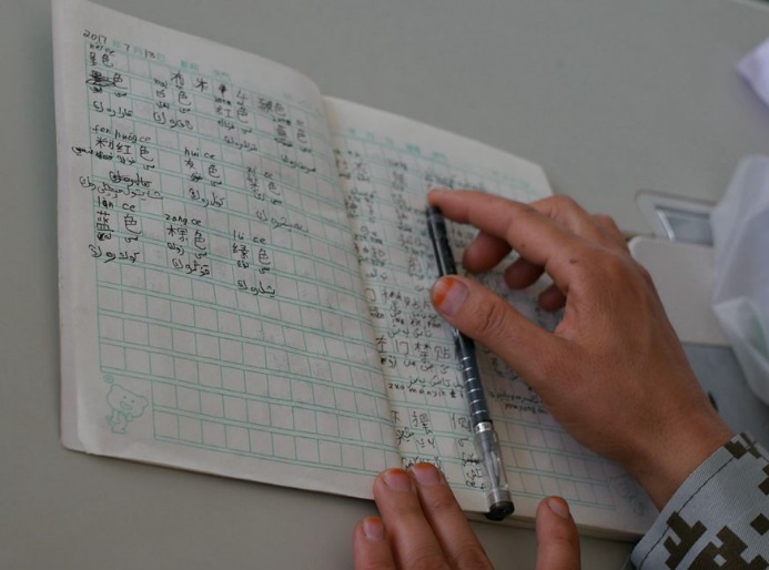 “绿色”“绿色”……“红色”“红色”……二楼大平层传来阵阵诵读声,300多名身着迷彩工装的维吾尔族新员工,在一名通晓汉语的班组长领读下,齐声复读各种颜色单词,对照着缝纫台上的双语笔记