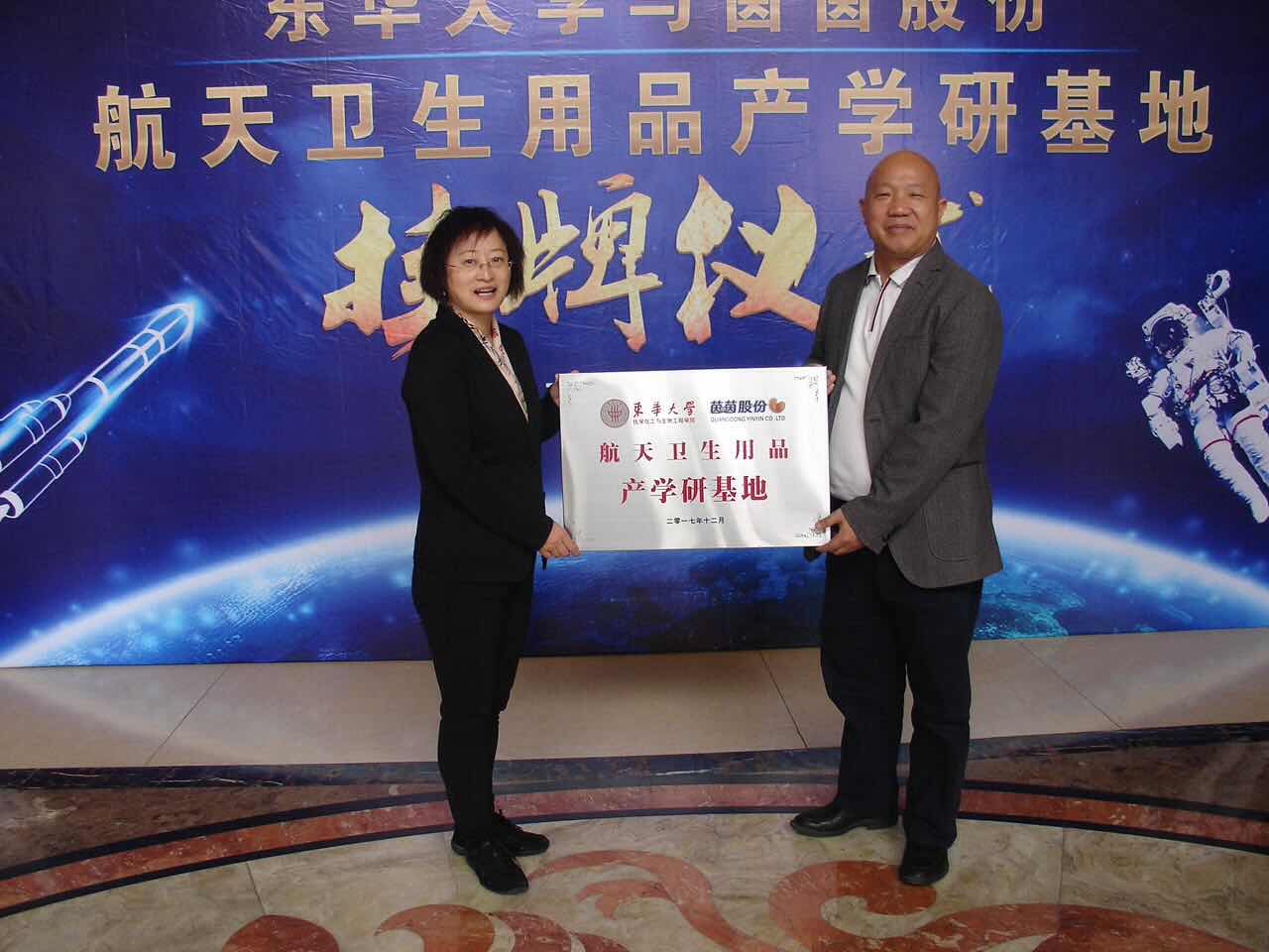 我校化工生物学院与茵茵股份有限公司长期进行产学研合作,取得良好成绩,企业将在学院设立航天卫生用品产学研基地。验收会次日,举行了产学研生产基地挂牌仪式。