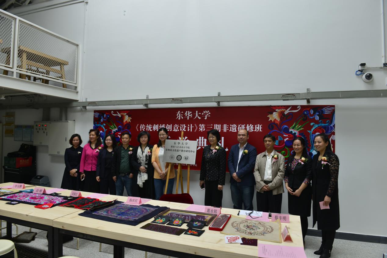 我校服装与艺术设计学院党委书记袁孟红,文化和旅游部非物质文化遗产司管理处副调研员岳青,上海文化广播影视管理局公共管理处(非遗处)处长杨庆红、副处长葛永铭,贵州省文化厅非遗处副处长李安鹏,上海社会科学院民俗与非遗研究中心常务副主任、上海民间文艺家协会副主席蔡丰明,上海市非遗保护中心专业业务指导钱张帆,校科研处副处长李凌燕,非物质文化遗产教育研究中心主任柯玲及全体研修班学员和教师代表参加活动。