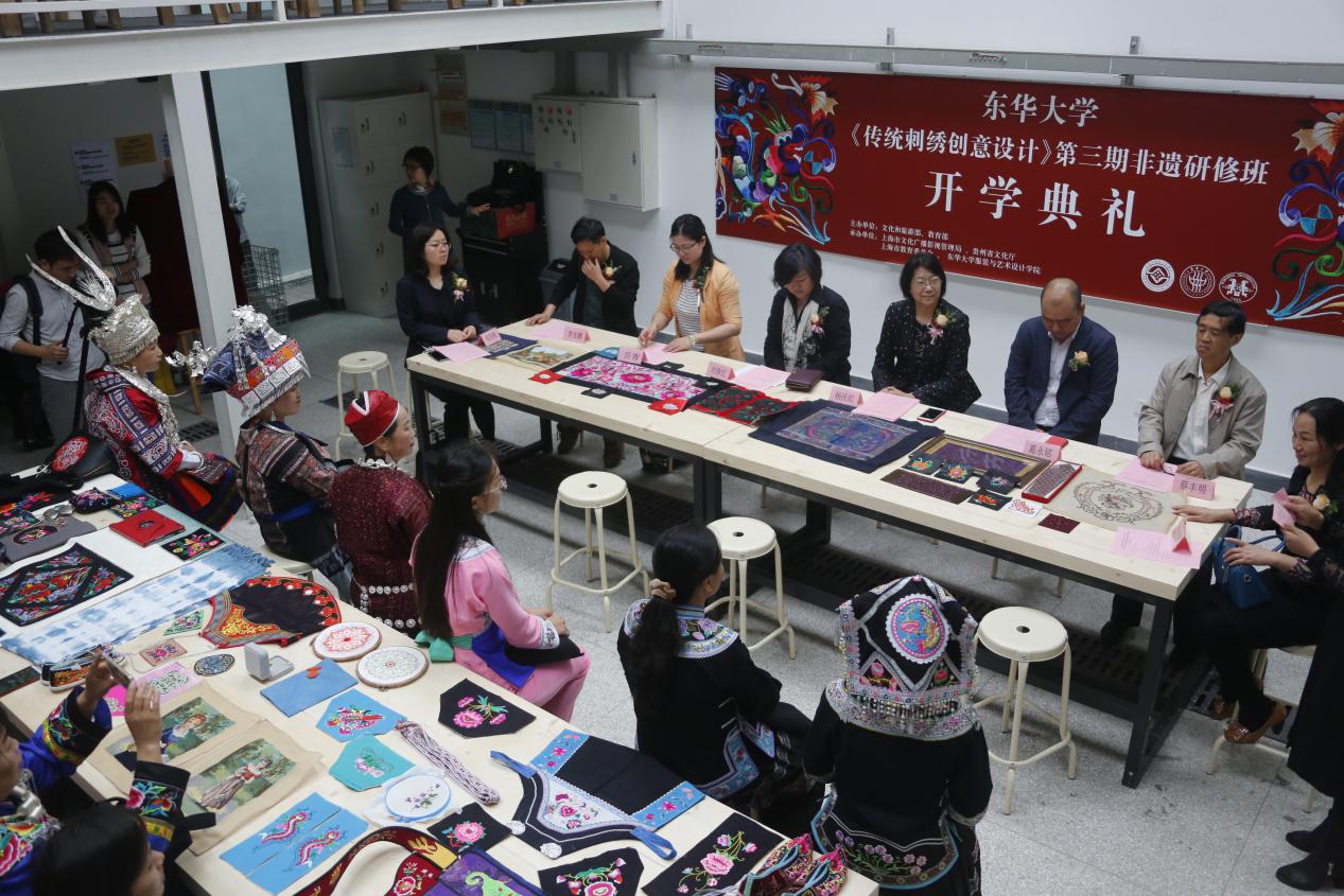 5月8日上午,一批身着盛装的少数民族同胞现身校园,她们是来自贵州的非物质文化遗产传承人,给延安路校区增添了一道亮丽的风景。我校第三期《传统刺绣创意设计》非遗研修班开学典礼在新落成的东华设计园举行,副校长刘春红出席。