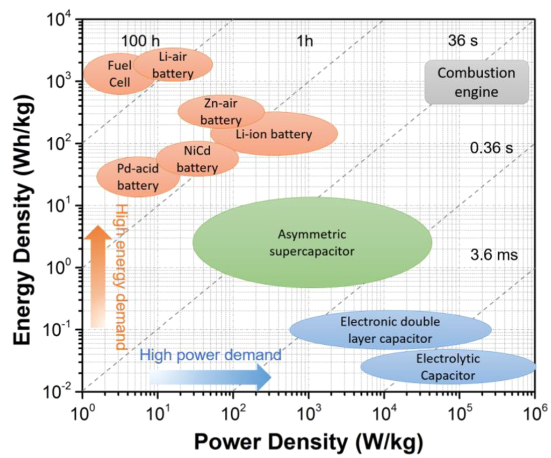 图1. 不同种类能量存储器件能量密度,功率密度和放电时间性能对比。