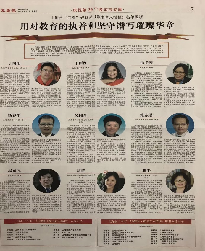 [文汇报]教师节前夕,上海市“四有”好教师名单揭晓,向教书育人楷模致敬!