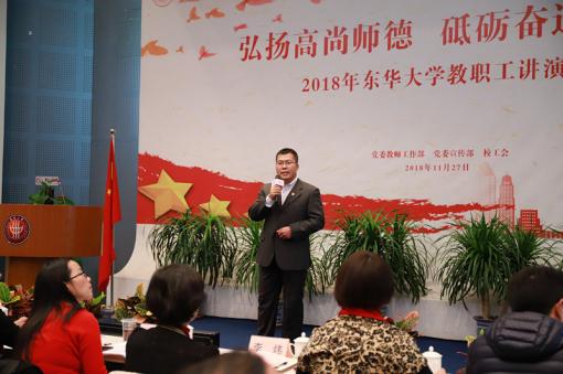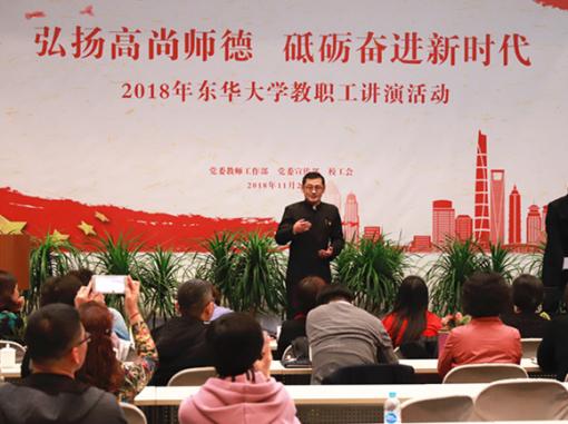本次活动得到了全校教职工的广泛参与,各学院部门积极推荐教师代表参赛。讲演内容均为原创作品。讲演中,老师们从“弘扬爱国奋斗精神,建功立业新时代”“改革开放40周年,教育奋进正当时”“弘扬高尚师德,潜心立德树人”三个方向切入,声情并茂地讲演东华人的故事,缅怀钱宝钧等老一辈知识分子的家国情怀和奉献精神,感沐优秀教师潜心育人的感人事迹,展现了东华教师坚守讲台、铸魂筑梦、立德树人的良好形象,坚定“四个自信”、在课程思政改革中勇于创新、追求卓越的时代风貌,传递出浓浓师德正能量。