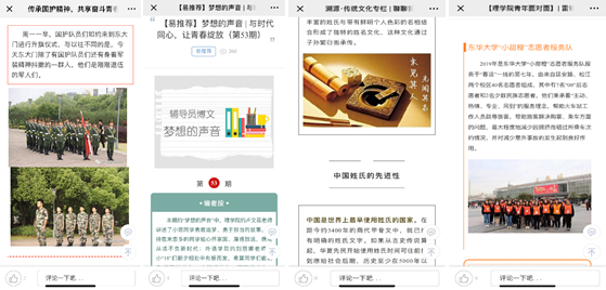 有了网络思政育人的“高原”,如何进一步凝练学校育人特色,发挥易班的网络价值引领的优势?近年来,学校在做强网络思政育人队伍上下功夫,抓住“关键少数”出实招,不断提升育人质量和成效,形成了一个又一个特色突出、成效亮眼的育人“高峰”。在东华易班网上,“五微名师工作室”成为大学生思想引领的知名品牌,学校的知名教授、“网红”思想政治理论课教师、优秀辅导员纷纷进驻,他们以实力开讲,用微课程、微视频、微漫画等学生喜闻乐见的方式旗帜鲜明地为学生答疑解惑,真正成为塑造学生灵魂和生命的“大先生”。同时,各学院易班平台上,辅导员聚焦学生的思想和行为特点,火热打造“鼎新思政讲坛”、“sunshine心理微课”等育人品牌,制作思政微课50余个。如辅导员讲授传统文化的易班系列课程,受到学生热捧,每堂微课都有上千次的点赞量。
