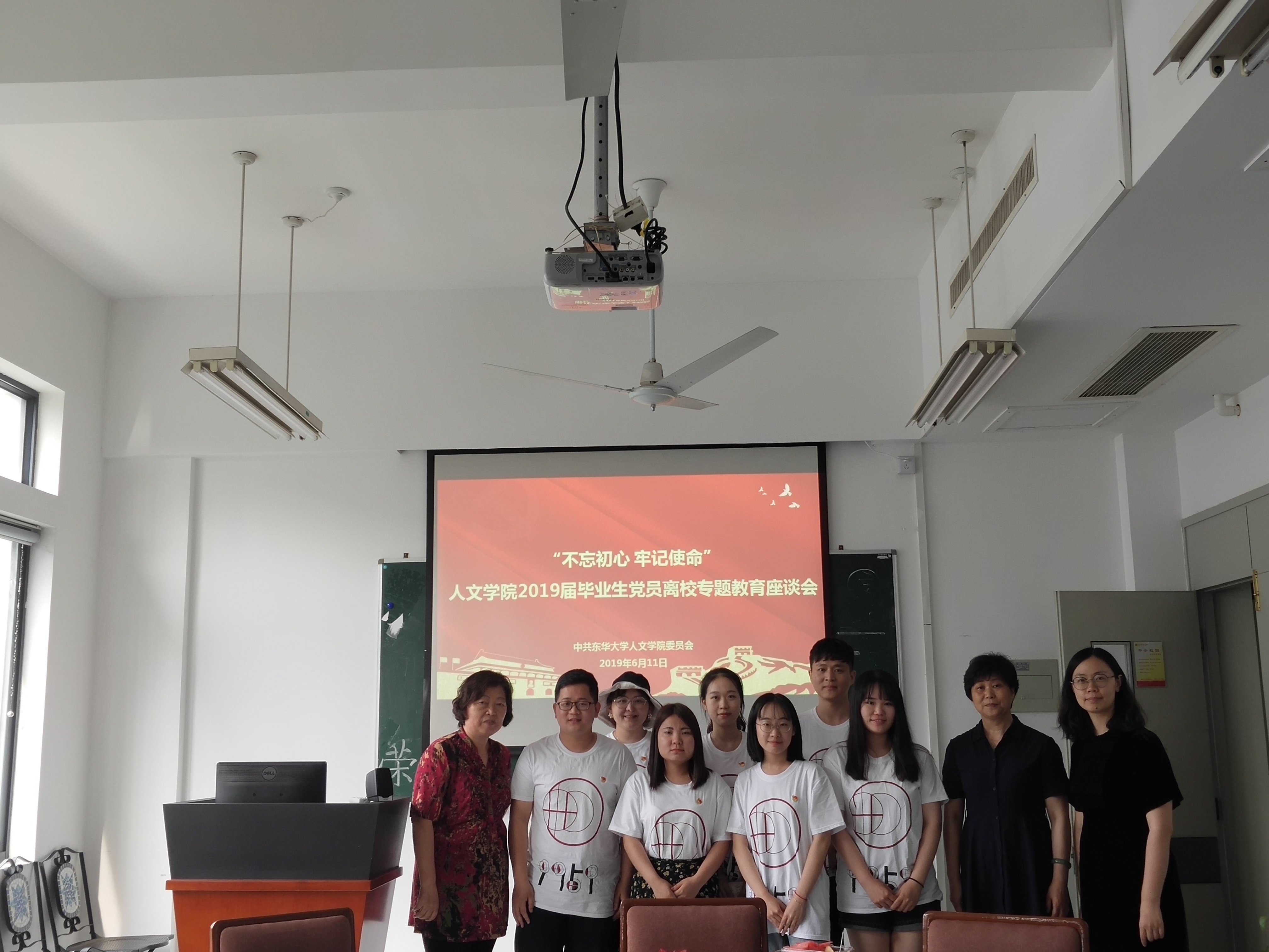 2019届毕业生离校在即,为确保毕业生安全、稳定、文明、愉快离校,有效推进平安校园、文明校园与和谐校园建设,切实做好毕业生党员离校前集中学习教育和组织关系转移管理等有关工作,人文学院党委于6月11日,开展了以“不忘初心、牢记使命”为主题的毕业生党员离校专题教育座谈会。人文学院党委书记王英,党委副书记罗薇娜,关工委丁霞萍,党委委员章礼强、叶长海、周卫平、周铮铮,以及毕业班辅导员、各学生党支部书记与学院2019届毕业生党员参加会议。