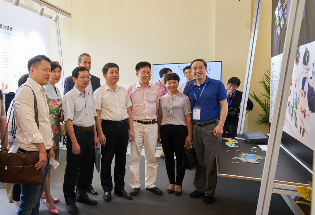 机械学院杨钟亮副教授带领学生团队紧跟垃圾分类魔都新时尚,创新设计了家庭智能分类垃圾桶,这个新装置让大家忍不住伸手一试;王思萍老师指导工业设计15级本科生杨昕粲带来的毕业设计作品“环境保护策略类桌面游戏——新星地球”,不一会就引来不少玩家,真可谓寓教于乐的高手。