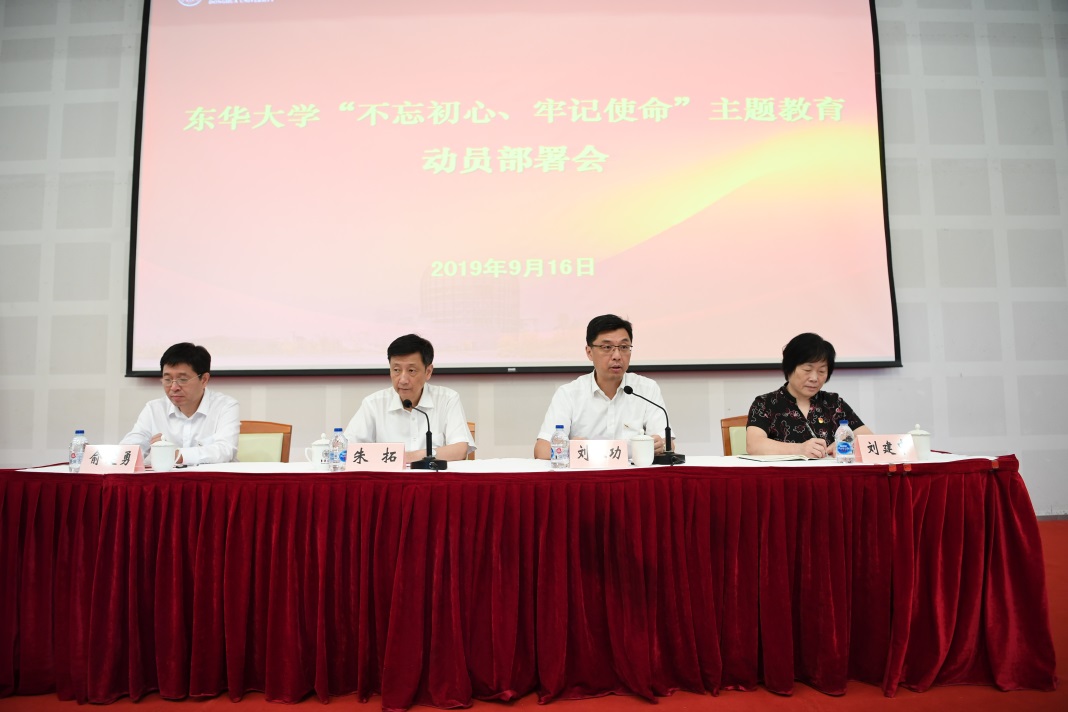 9月16日,我校“不忘初心、牢记使命”主题教育动员部署会在松江校区举行。校“不忘初心、牢记使命”主题教育领导小组组长、党委书记刘承功主持会议并对全校开展主题教育进行动员部署。教育部直属高校“不忘初心、牢记使命”主题教育第六巡回指导组组长朱拓出席会议并讲话。主题教育第六巡回指导组副组长、教育部党建工作联络员刘建中到会指导。俞建勇、刘淑慧、崔运花、金海燕、邱高、卿凤翎、舒慧生等在校领导班子成员出席会议。