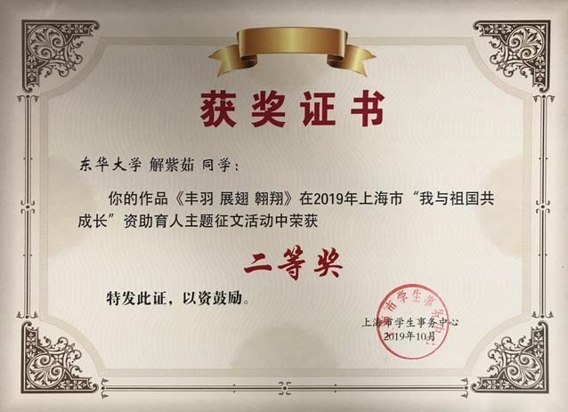 据了解,“主题征文活动”旨在以庆祝新中国成立70周年为主题,通过讲述自己在国家资助政策下的成长历程,激励广大学子奋发学习、勇于担当、积极投身中国梦。征文活动得到了广大学子的积极响应,共收到投稿70篇,经评选,推荐研究生和本科生作品各1篇参评上海市“我与祖国共成长”主题征文活动。