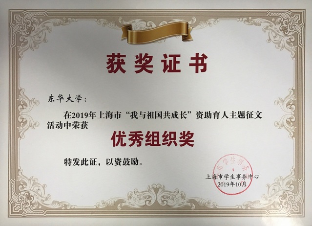 近日,从上海市学生事务中心传来喜讯,我校环境学院研究生解紫茹同学的《丰羽展翅 翱翔》和人文学院本科生孙晓冬同学的《祖国伴我成长》在上海市2019年“我与祖国共成长”资助育人主题征文活动(简称“主题征文活动”)中分获二、三等奖,我校荣获优秀组织奖。