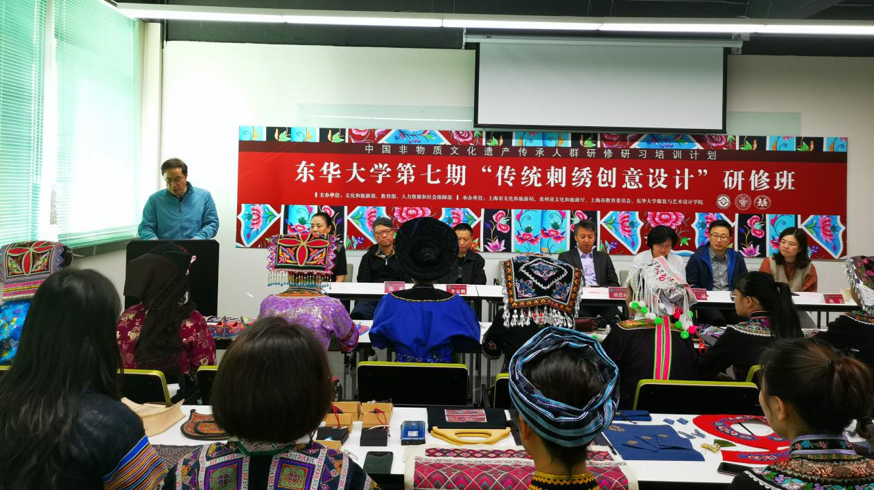 11月6日,我校第七期中国非物质文化遗产传承人群研修研习计划“传统刺绣创意设计”研修班在延安路校区开班。副校长陈南梁出席开班仪式并致辞,上海市、贵州省的相关部门领导,企业代表及我校相关部门负责人和全体非遗研修班学员一同参加活动。