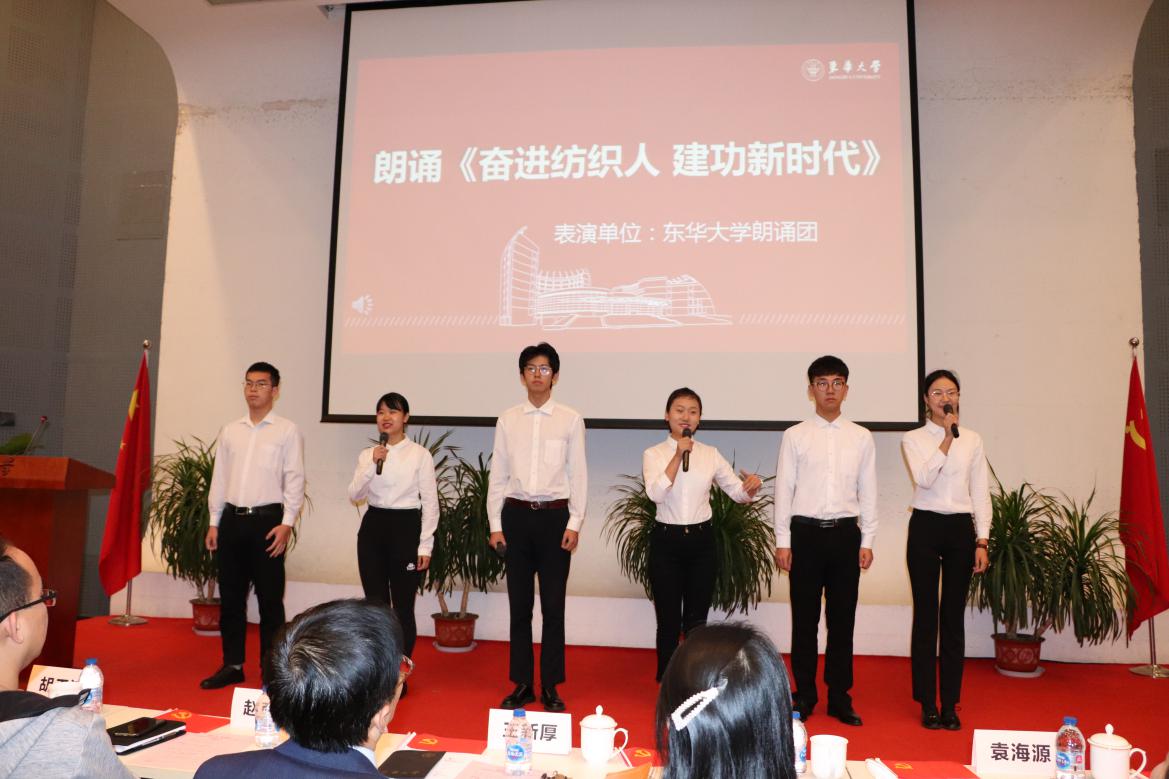 学校朗诵团带来诗朗诵《奋进纺织人,建功新时代》,他们用“经纬”诉说着千百年来纺织的演变与传承以及纺织人的责任和使命。
