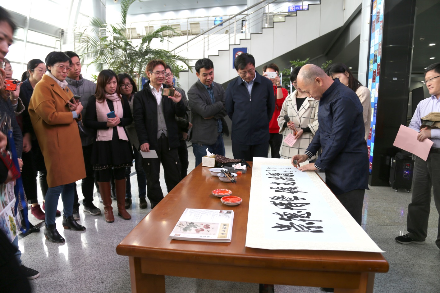 方建安在开幕式上致辞,向陈志宏的到来表示欢迎与感谢。他说,文化传承创新是高校图书馆的重要职责和使命,书画艺术是中国传统文化的重要载体,是高尚审美情趣的重要体现。本次书画展不仅为师生提供了近距离欣赏感悟书画魅力的机会,也将进一步丰富校园文化推广的载体与形式,引导师生坚定文化自信。陈志宏针对相关展品进行了精彩解析,向广大师生分享了艺术创作的初衷和感悟,并现场挥毫题词校训“崇德博学、砺志尚实”相赠。师生们流连驻足于作品前,细细揣摩品味。
