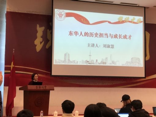 课上,刘淑慧对学生如何成长成才提出三点建议:以家国情怀济天下,做一个“博德博雅”之人;融汇科学精神与人文情怀,做一个“通识广达”之才;以心怀世界的大视野求学,做一个“格局开阔”之才。她建议,作为东华学子在科研上要能够“走出去”,做心怀世界的大视野求学,做“格局开阔”之才,做勇做走在时代前列的奋进者、开拓者,书写无愧于时代的青春之歌和精彩人生。