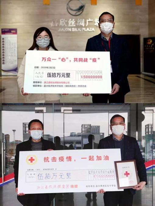 工贸85级校友、嘉兴校友会副会长徐鸿任总裁单位——浙江嘉欣丝绸股份有限公司通过嘉兴经济技术开发区(国际商务区)慈善总会和嘉兴秀洲区红十字会共捐赠人民币100万元,用于抗击疫情工作并组织志愿者服务队帮助当地口罩生产企业恢复产能;