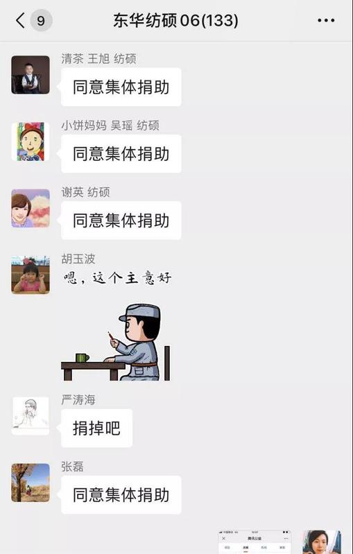 去年,纺织学院2006级硕士校友组织了毕业十周年返校聚会。今年1月底,看着不断攀升的确诊人数,吴双全、孙汉健、王超辉、陈涵、姜华、叶剑新、竺铝涛和刘肖燕等几位聚会组织者想把十周年聚会时结余的班费5172元捐赠给武汉。负责财务工作的朱月群在微信群里征求大家意见,在得到了整齐划一的同意之余,更得到了不断追加的捐款,甚至有“东二代”将压岁钱悉数捐出,短时间内即筹集到了10711元。