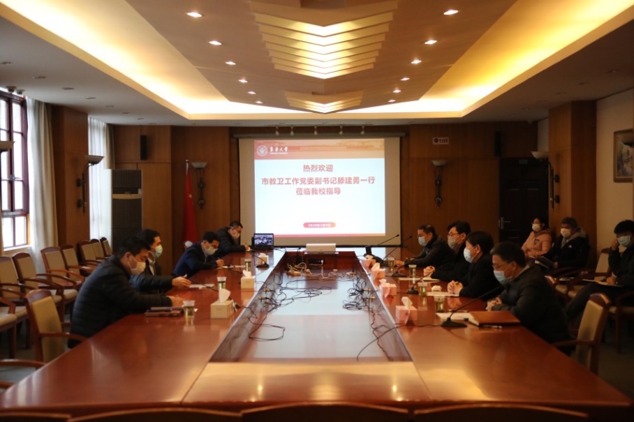 3月3日上午,上海市教卫工作党委副书记滕建勇一行来我校调研指导新冠肺炎疫情防控和在线教学推进工作,党委书记刘承功,校长俞建勇,副校长陈南梁、舒慧生陪同调研。市教卫工作党委及我校相关部门负责人参加调研,调研座谈会由陈南梁主持。