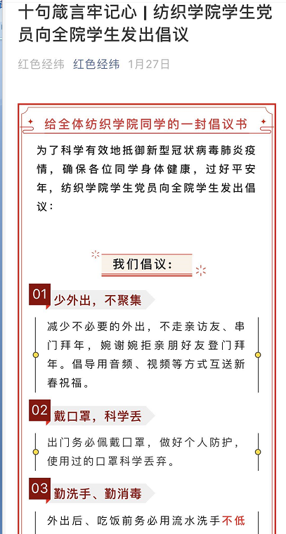 在学院党委的号召下,纺织学院各学生支部通过线上“云”组织生活的方式,借助学习强国平台,以交流讨论、视频会议等形式召开了一场主题为“一心‘移疫’,筑起战‘疫’青春防线”的组织生活会。各学生支部组织党员认真学习领会党中央疫情防控指示精神和学校防控工作要求,纷纷表达了要一切行动听指挥,做好科学防控知识的传播者,认清在疫情防控工作中肩负的责任和使命。其中,学生党员赵泽阳在参与后说道“在这次疫情中,我深刻感受到了万众一心齐心抗疫的中国精神,我作为一名中国人感到骄傲;而作为一名纺织人,疫情防控工作中的纺织力量也让我更加坚信了我的专业选择。”与此同时,学院通过红色经纬微信公众平台,先后推出了由学院党员师生带头主动发声的“十句箴言牢记心”的倡议书,“战‘疫’纺院党员说”“战‘疫’纺织人战疫故事”等专题系列宣传帖,在网络上倡导人人守责、人人担责、人人尽责,为打赢这场战役树立信心和勇气。