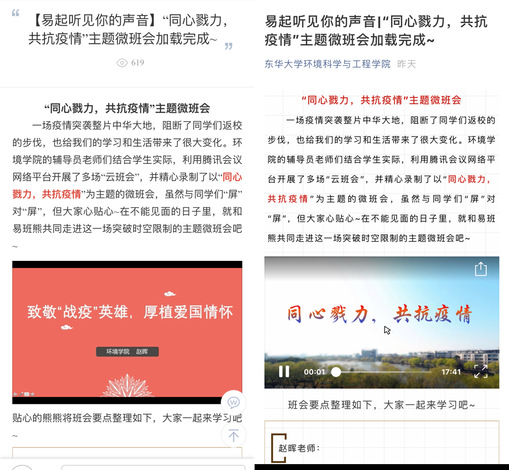 为了更好地给予同学们抗击疫情的信心和战胜疫情的勇气与力量,环境学院的辅导员们还将班会内容整理录制为“微班会”,通过易班、微信公众号发布后,收获了700余次点击量,学生们反响热烈。环境学院学生工作办公室致力于将网络班会打造成特殊时期学生德育新阵地,跨越空间障碍,充分发挥网络育人功能。