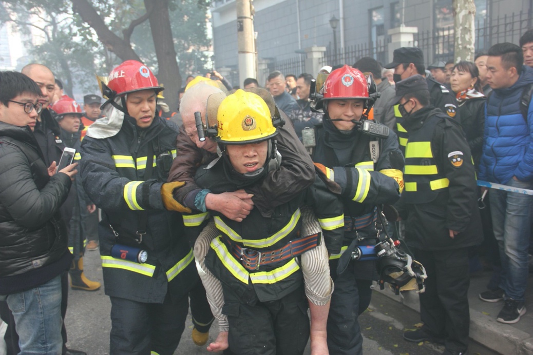 (施成成与战友合力从火场救出老人)