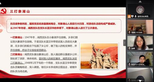 6月23日,继六月初“学习‘四史’,不忘初心,勇担使命”主题周五论坛之后,“学思先锋”硕士研究生党支部选取中国共产党在99年发展历程中抗日战争、解放战争这一特殊历程进一步深化“四史”学习教育,开展“忆革命峥嵘岁月,承新时代责任担当为主题的党日活动。校党委副书记刘淑慧,人文学院党委书记王英,院长、党委副书记张科静,党委副书记罗薇娜,副院长、党委委员吴志刚,学生办公室主任、研究生辅导员汪永安、党建辅导员穆莉出席本次活动。“学思先锋”硕士研究生党支部全体党员及19硕入党积极分子参与此次主题党日。