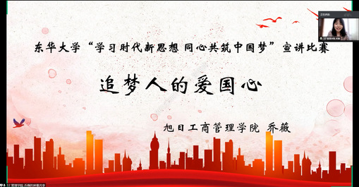 7月16日,“学习时代新思想同心共筑中国梦”第三届校园宣讲比赛暨“学习习近平新时代中国特色社会主义思想”大学生理论宣讲团选拔赛依托线上进行,上海市学生德育发展中心杨智勇、上海教育系统网络文化发展研究中心王震威、学生处相关老师及“学习进行时”大学生理论宣讲团指导老师出席并担任评委。