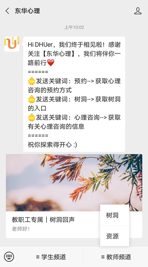 3.  关注微信公众号“东华心理”(dhuxinli),进入“教师频道”,点击“树洞”,则可查看进入树洞的方式。