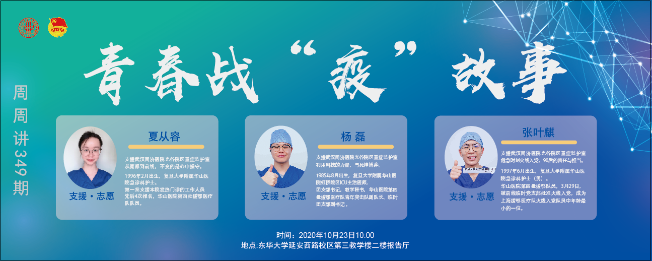 讲座简介本期讲座邀请到三位复旦大学附属华山医院第四批援颚医疗队队员,他们或是掌握前沿医疗科技,与死神博弈;或是首批报名赴鄂,勇敢逆行;或是于最危急时刻火线入党,急赴前线。他们的抗疫故事是牺牲小我奉献大我的无畏选择,是把奋斗精神付诸于实践的现实写照。希望这场精彩的创新型思政课能为东华青年鼓舞精神、更加辨明前进的方向。