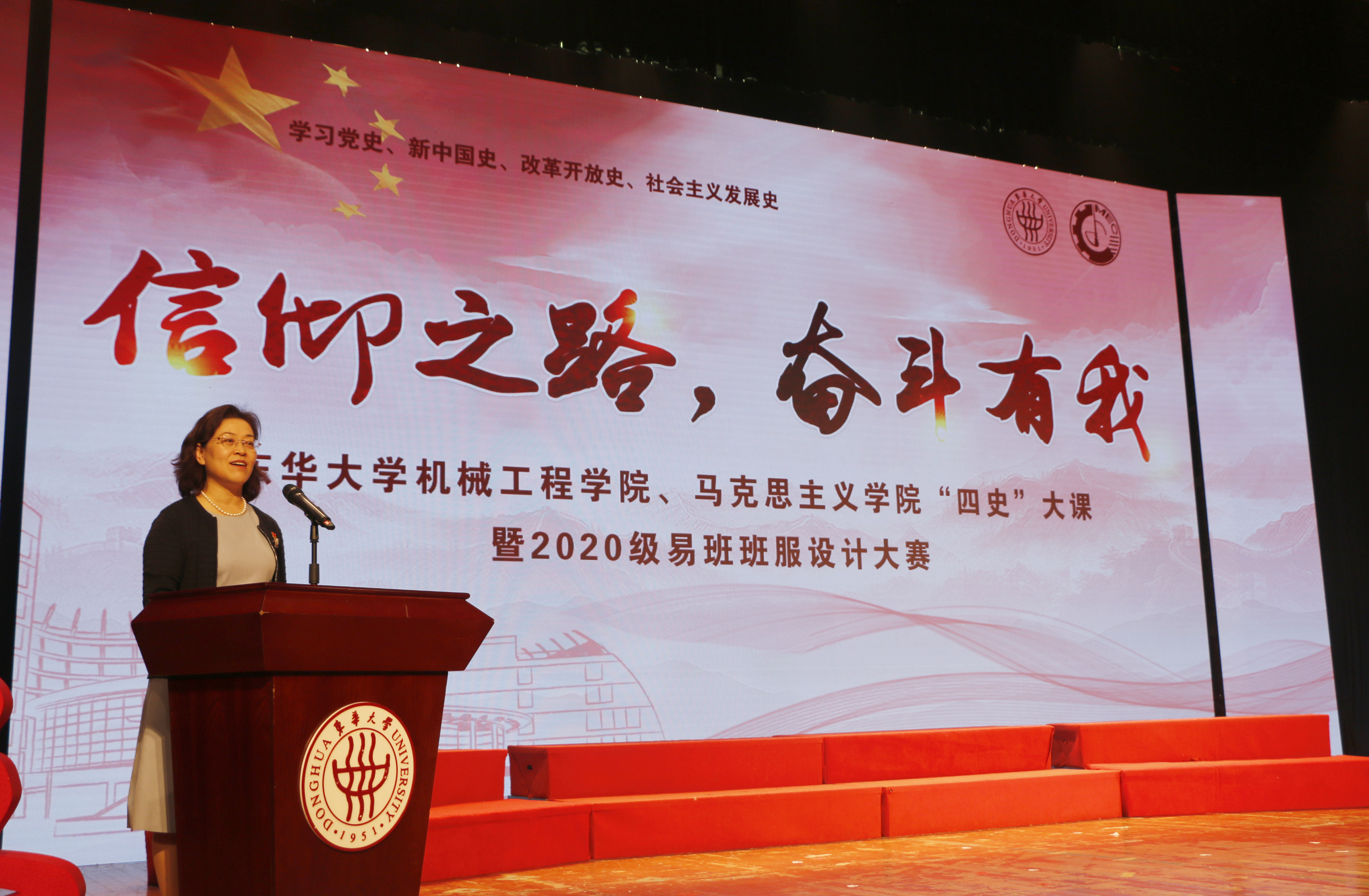 “日月辉映,孕育灿烂人类文明;经天纬地,织就绚丽锦绣中华……”伴随着《东华之歌》的悠扬旋律,机械工程学院、马克思主义学院“信仰之路,奋斗有我——‘四史’大课”于11月3日在松江校区锦绣会堂拉开帷幕。从老一辈华纺人到新一代东华人,穿越时空的记忆,以共同的“东华人”身份,演绎党的辉煌历史,在砥砺奋进中续写新的时代华章。党委副书记崔运花出席大课并致辞。机械工程学院党委书记王新厚,马克思主义学院党总支书记戴叶萍,党委组织部副部长、党校副校长徐玥,学生处副处长赵彦明,两学院党员师生及全体20级新生参加大课。