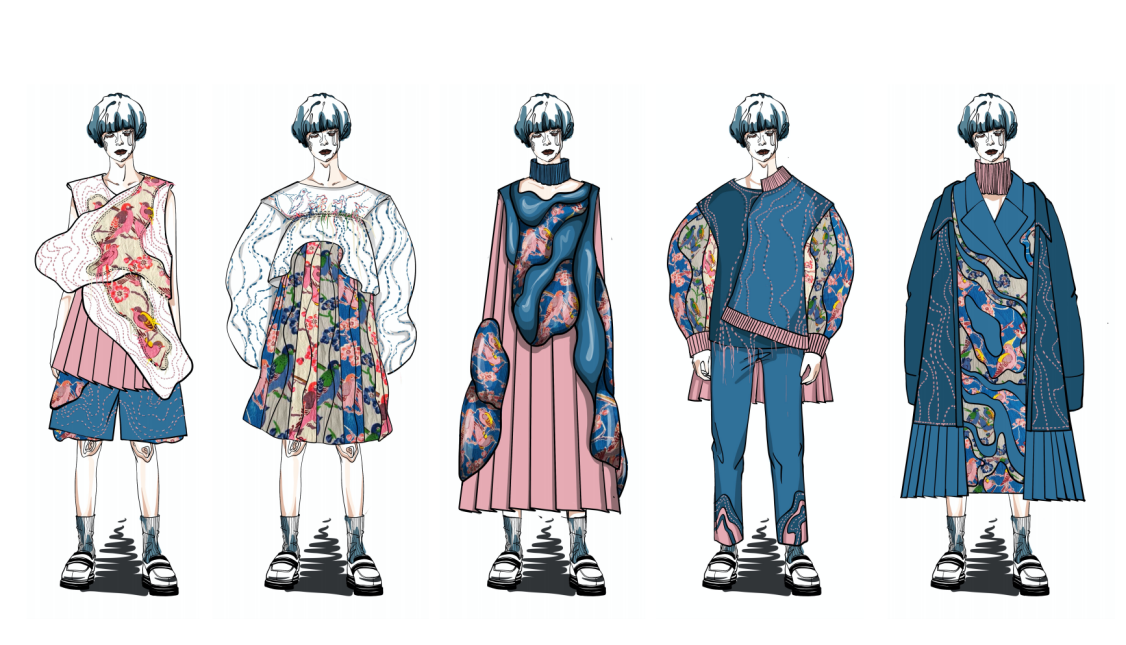 以明亮鲜艳的红色为主调的《喜上眉梢啊》系列服装,打破了人们对苗族以蓝、黑、白为主,较为深沉的传统印象。作品设计灵感来自黔东南苗族“蝴蝶妈妈”的传说,由研二学生赵一格与传承人石柳莎、李芳、靳会合作完成。在工艺上,将蝴蝶妈妈、花、鸟等苗族纹样用锁绣、平绣、缠绣等绣在印花面料上,提升了服装的立体感。