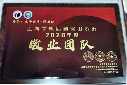 1月12日,我校保卫处被上海市学校后勤协会、上海市高等教育学会保卫工作专业委员会、上海市教育后勤管理中心联合授予上海学校后勤保卫系统2020年度敬业团队称号,该奖项旨在表彰对战斗在一线的保卫同仁们的工作肯定,阻击疫情积极营造安全稳定的校园环境所做出的贡献。